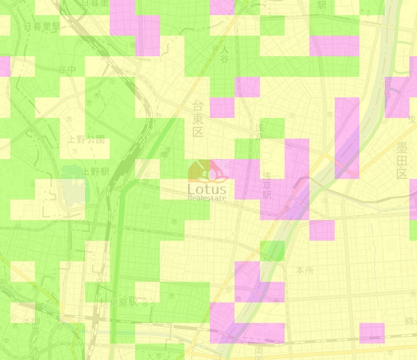 台東区は、隅田川や神田川に近い低地が多く、地盤の性質上、液状化のリスクが指摘されています。大地に近い区の西部は液状化の可能性も低くなるようですね。
