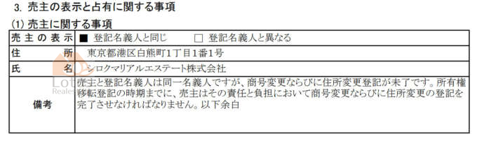 取引の売主の情報を確認します。事例のケースでは社名変更により登記簿謄本に記載する内容が違いますので説明しています。