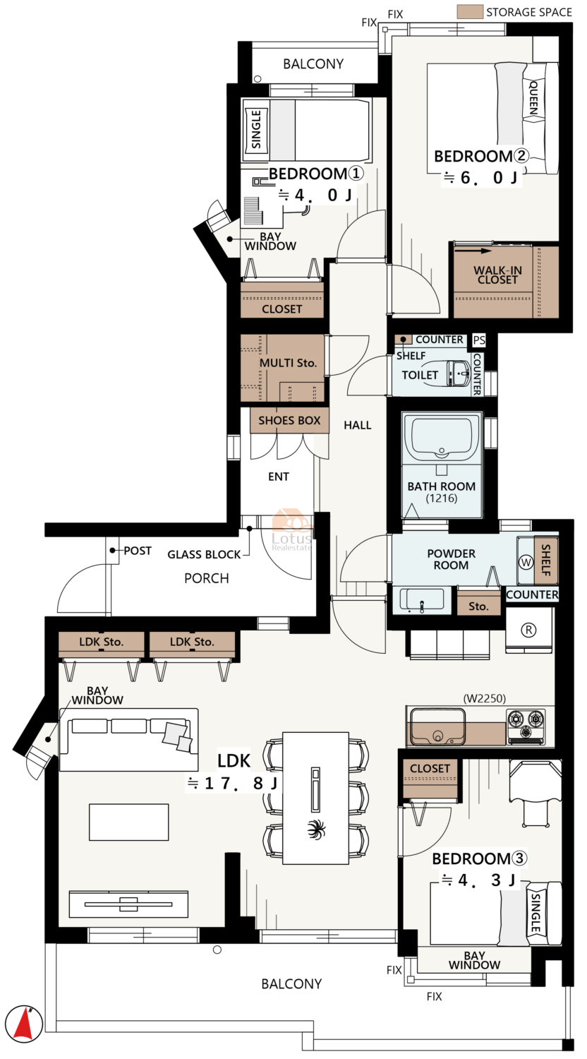 専有面積76㎡超の広々3LDKで、全居室に開口部がある2面採光・2面バルコニーの設計は、通風・採光の良さを重視するお客様のニーズを満たし、明るく快適な生活空間を提供します。