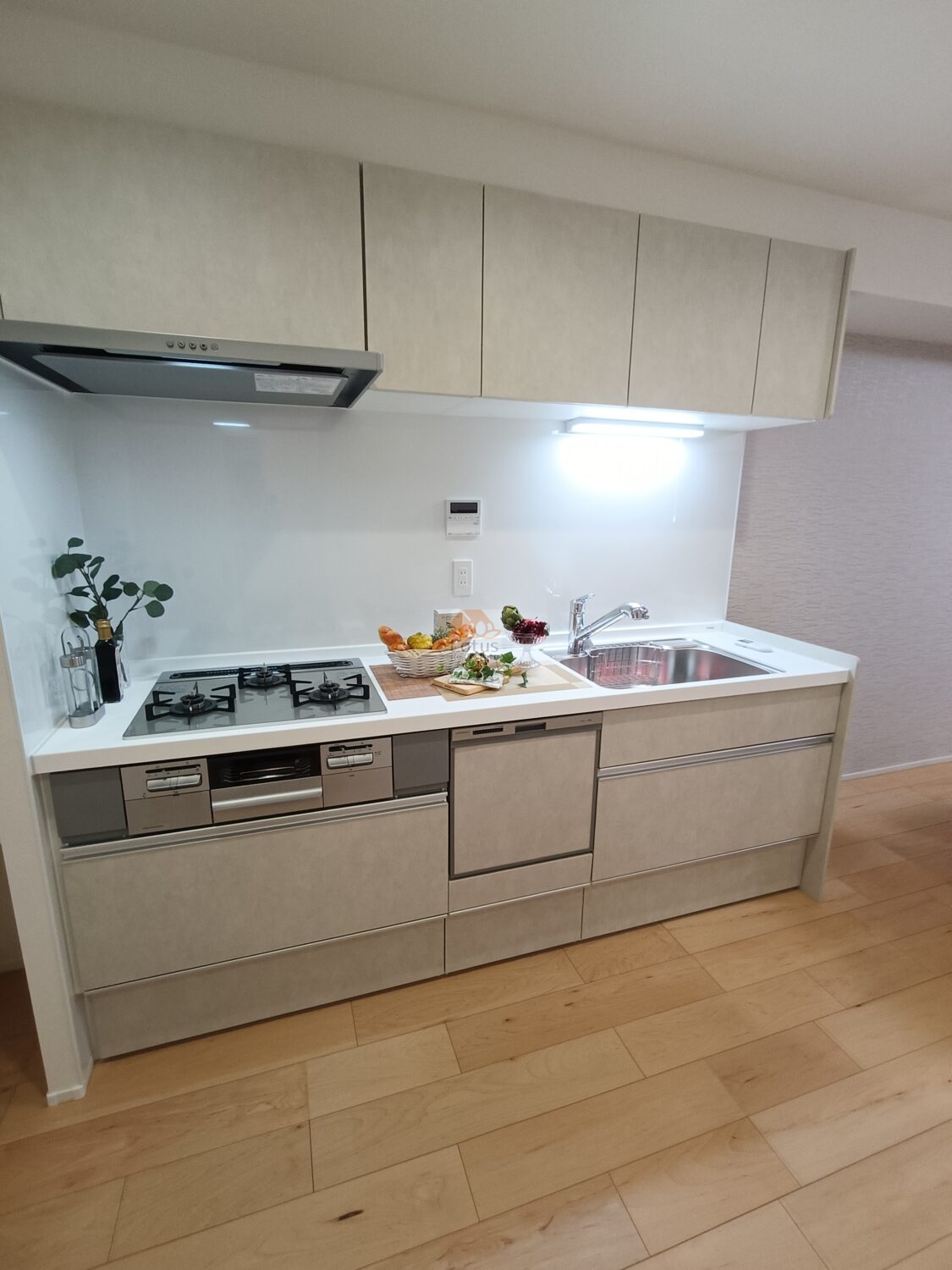 リノベーション: 大規模修繕工事(2023年7月)実施済み、新規フルリノベーション、システムキッチン(食洗機付き)、ユニットバス (浴室換気乾燥機付き)、洗面化粧台、シャワートイレ、洗濯水栓・防水パン、エアコン、給水・給湯・排水管更新、給湯器、フローリングクロスフロアタイル、建具、シューズボックス、玄関人感センサースイッチ、全室照明器具二重サッシ (LDK・洋室2)、ハウスクリーニング等