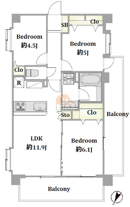 60.88㎡の3LDK、北・東・西の三方角部屋で、陽当り・通風が良好です。2面バルコニーで洗濯物も干しやすく、明るく開放的な空間で新生活を送りたい方におすすめです。