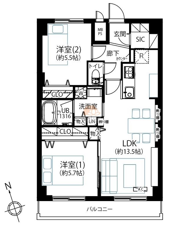 面積 | 57.96m² 壁芯(バルコニー5.5m²) | |||