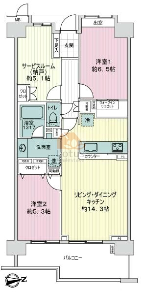 3LDKの間取りにはサービスルーム(納戸)やウォークインクローゼット、そして約10.65㎡の広々としたバルコニーがあり、収納力と開放感に優れています 。収納不足で悩むファミリー層のニーズに応える設計です。