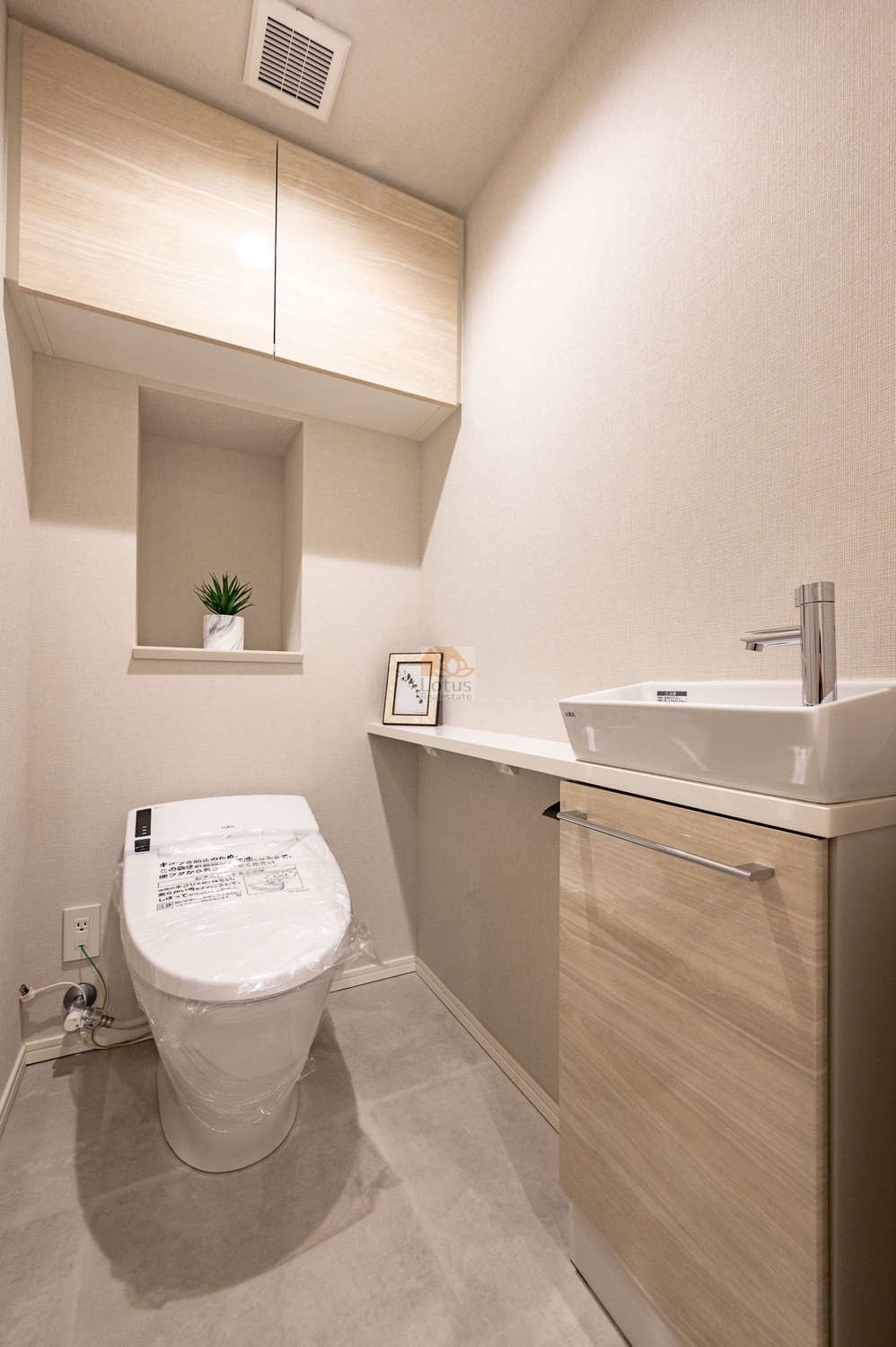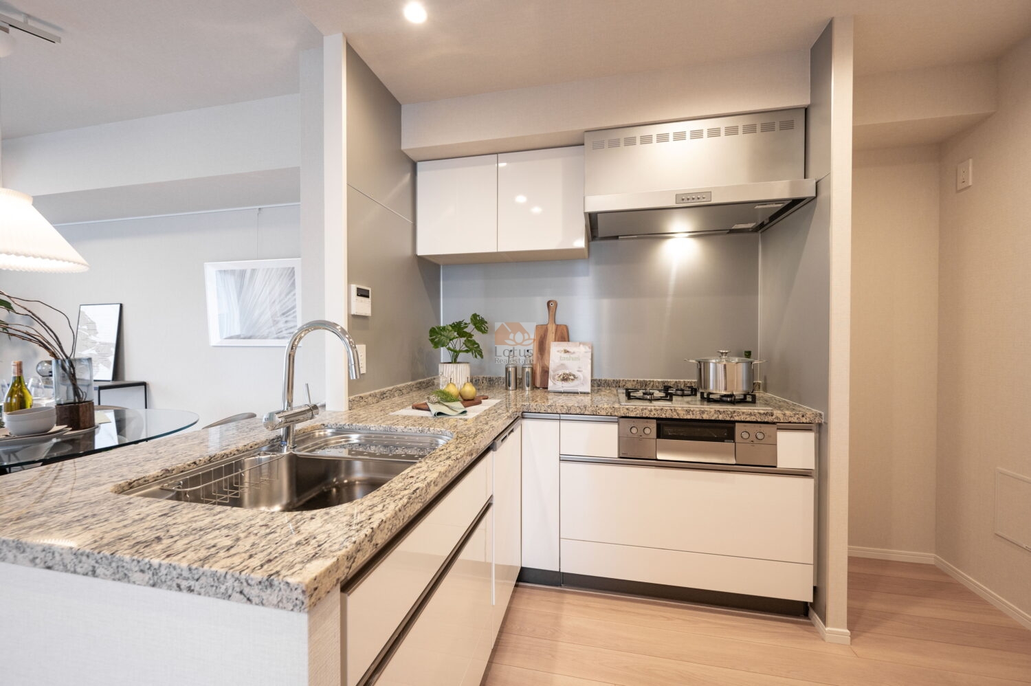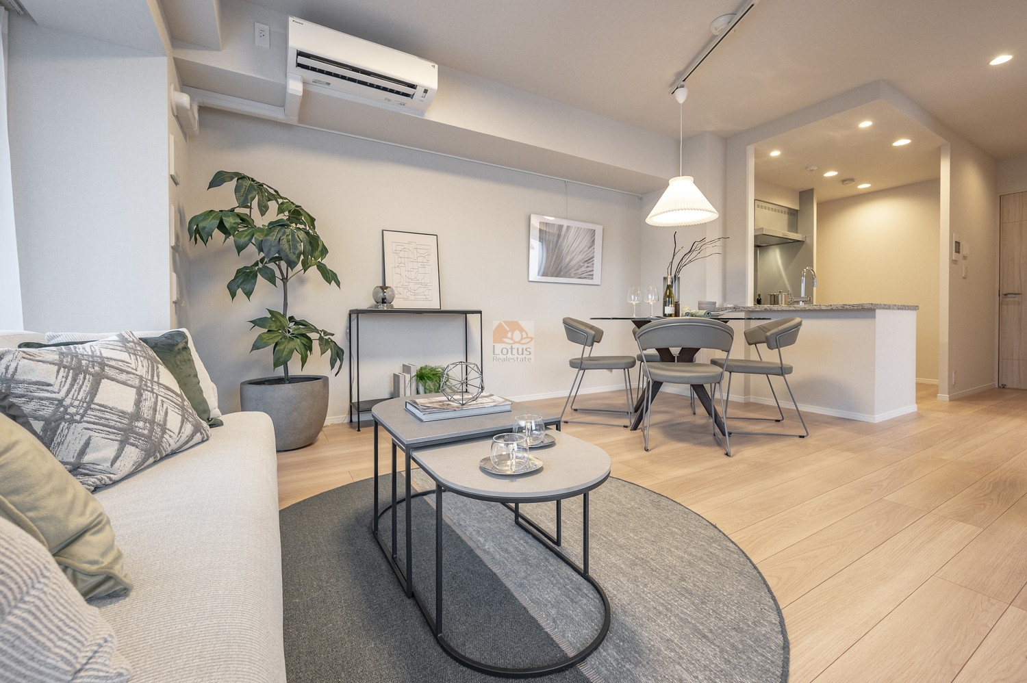 リノベーション:フロアタイル新規貼替、ガラストップコンロ新規交換、ビルトイン浄水器付ハンドシャワー水栓新規交換、LIXIL製洗浄便座付トイレ新規交換、床暖房マット新規交換(LD)、壁・天井クロス新規貼替、照明器具新規設置、エアコン4基新規設置