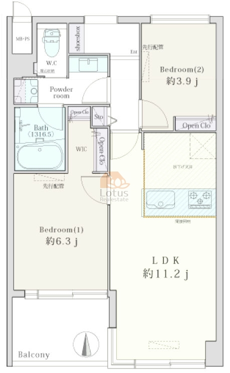 新規リノベーションにより水回りを含む設備が一新され、新築同様の快適性を手に入れることができます。LDK約11.2帖を含む2LDK+WICの間取りは、機能的で無駄のない、洗練された都心生活を提供します。