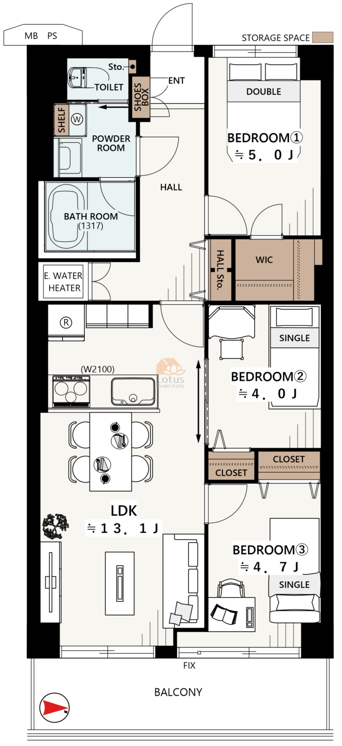 3LDKファミリータイプで大容量のWICや各所に収納スペースが確保されており、お子様がいるご家庭や、収納不足に悩むファミリーに最適な住まいです。対面キッチンは、料理をしながら家族とのコミュニケーションをとりたい方にぴったりです。