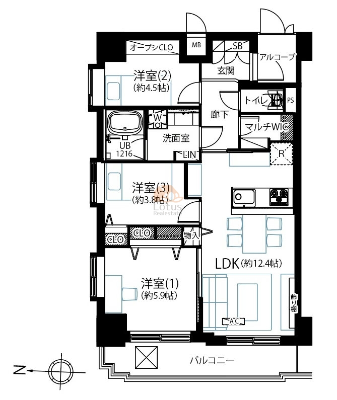 新規フルリノベーション済みの角部屋住戸で、家具・エアコン付という特典もあります。LDK約12.4帖、洋室3室の間取りで、収納も豊富(マルチWIC、オープンCLOなど)なため、新生活に必要な初期費用を抑えつつ、すぐに快適な暮らしを始めたいご家族に最適です 。