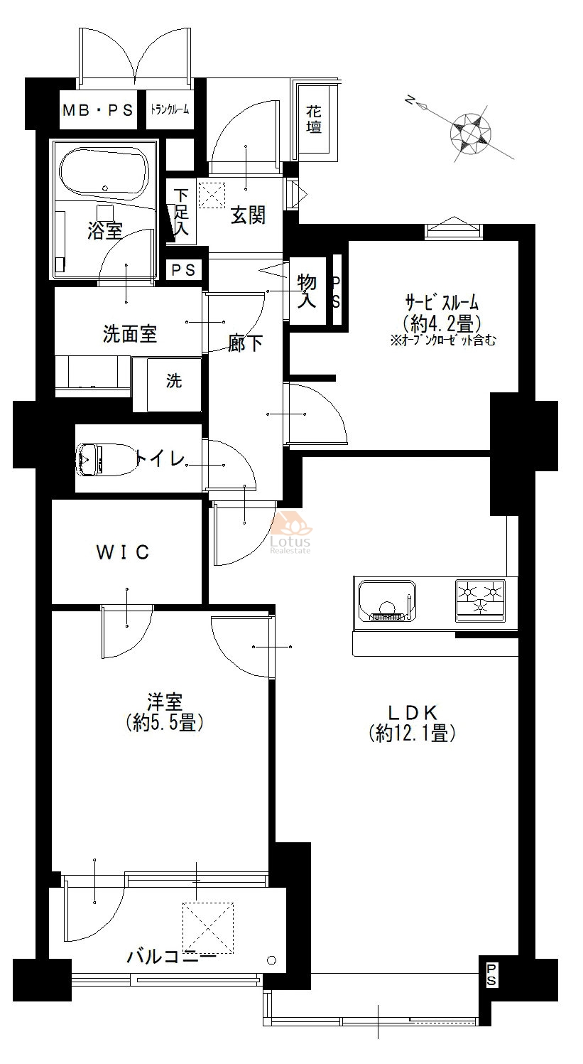 サービスルーム(約4.2帖)とWIC付きの1SLDKの間取りで、全室にエアコンが新規設置されるため、エアコンを新たに購入する手間と費用を省けます。LDKは約12.1帖とゆとりがあり、一人暮らしからDINKS、またはテレワークスペースを確保したい方にも最適です 。