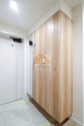 リノベーション:システムキッチン交換、ユニットバス交換、洗面台交換、トイレ交換、全室クロス張替、CF張替、下足入れ交換、洗濯水栓器具交換、防水パン交換、スイッチパネル設置、全フローリング張替、ダウンライト設置、全建具交換、照明器具設置