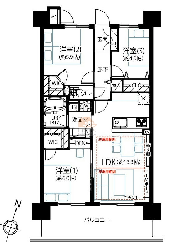 | 面積 | 64.26m² 壁芯(バルコニー12.6m²) | |||