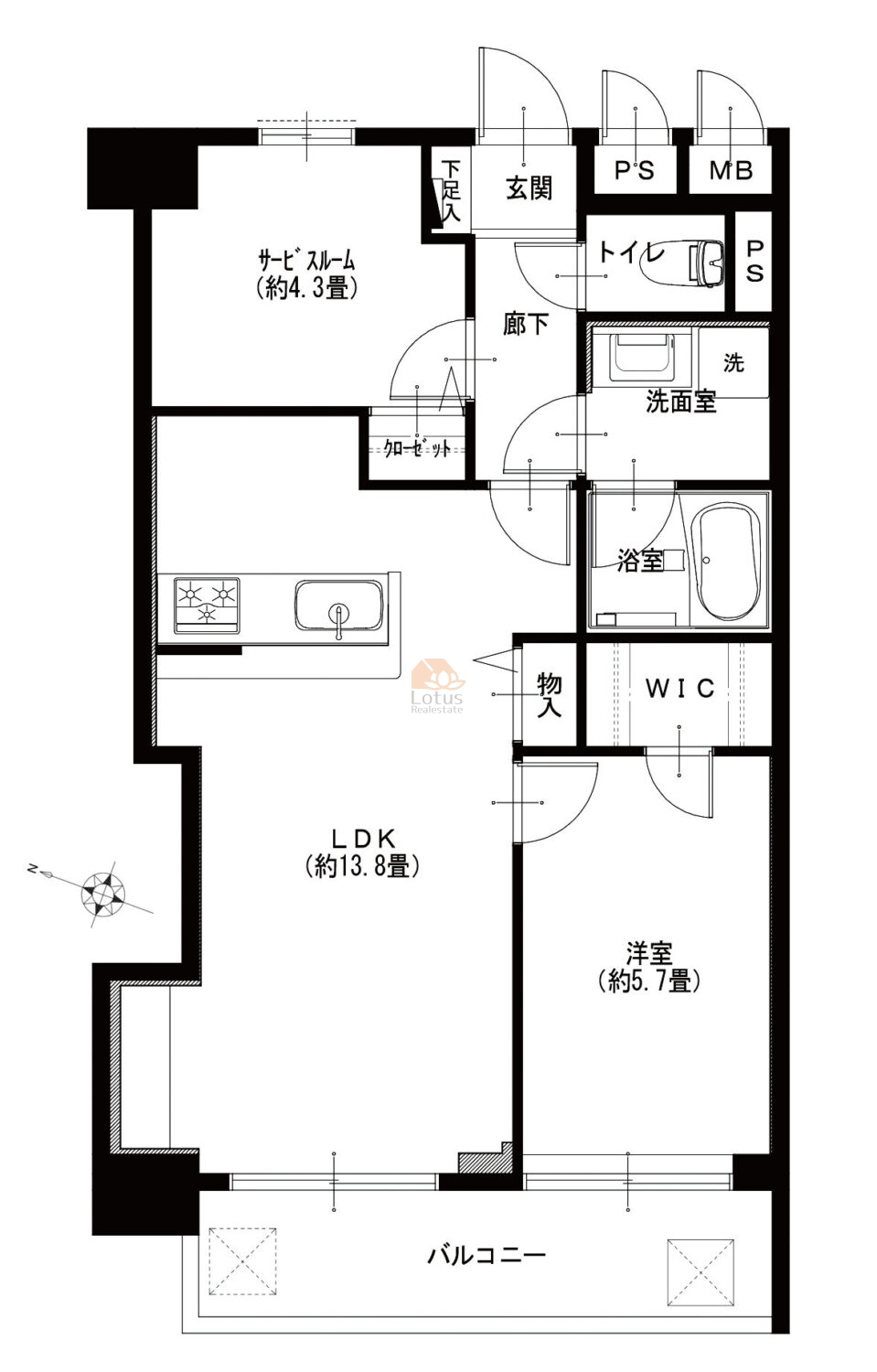 角部屋で、LDK約13.8畳と洋室(約5.7畳)に加え、サービスルーム(約4.3畳)とWICがあり、収納力と多様な空間利用が可能です。オートロックや防犯カメラでセキュリティも安心です。