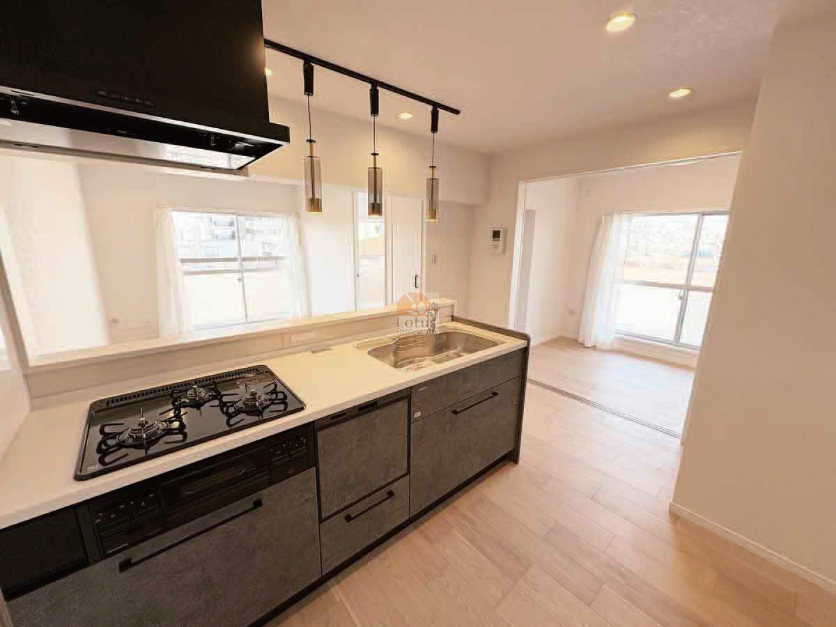 リノベーション:システムキッチン(浄水器内蔵シャワー水栓・食洗機)、ユニットバス(ワイドミラー・浴室乾燥暖房機・追焚機能付・LEDダウンライト・アクセントパネル)、洗面化粧台(3面鏡・シャワー水栓)、トイレ(温水洗浄機能付)、フローリング、建具、下足入、給湯器、壁・天井クロス、給水管(MBより新規)、排水管(専有部分内新規)、室内クリーニング(2025/12/9完成)