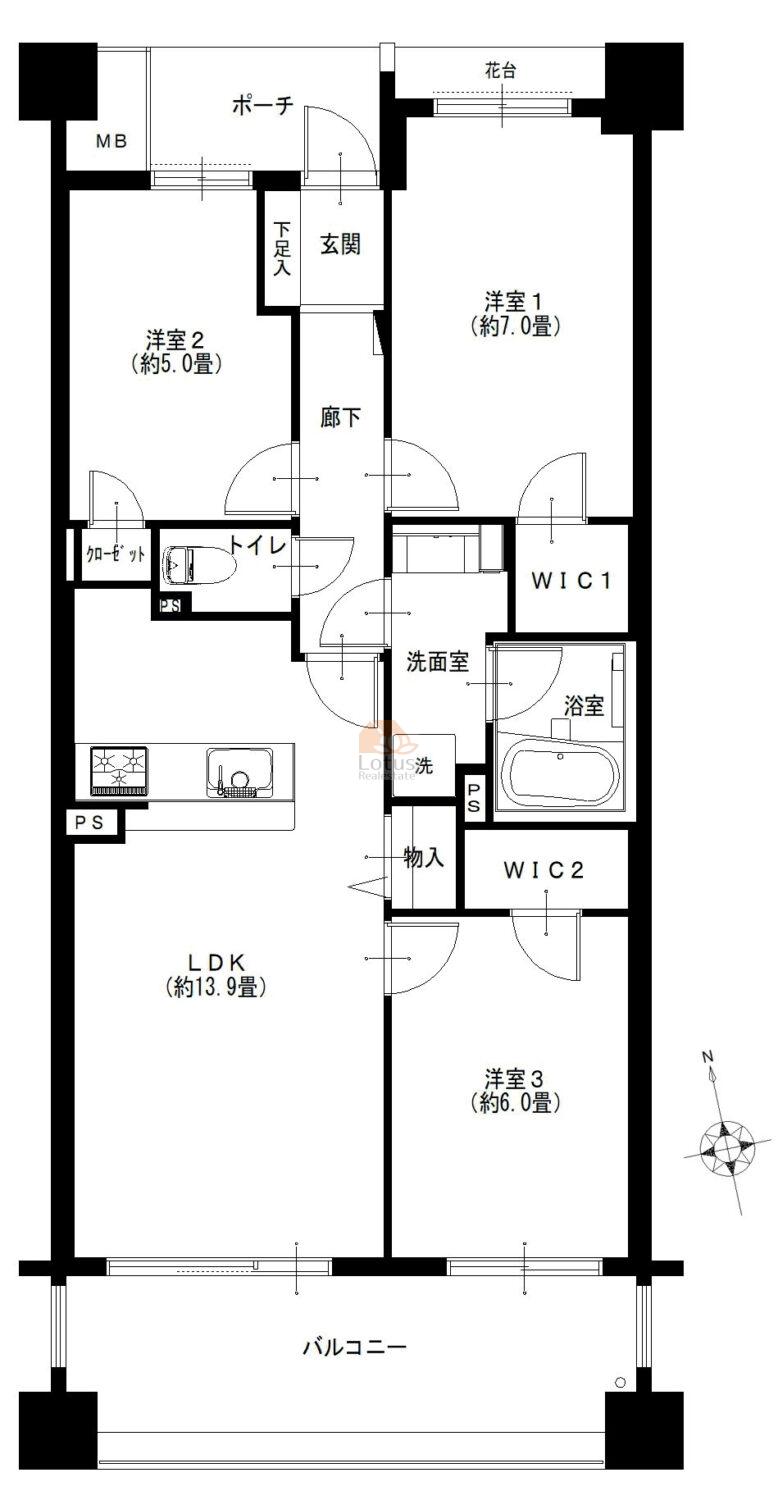| 面積 | 70.05m² 壁芯(バルコニー12.1m²) | |||