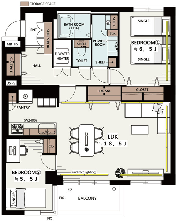 18.5帖という広々としたLDKは、北欧風のヒュッゲスタイルを採用し、温かみのある木目調が日々の疲れを優しく解きほぐします。全居室5.5帖以上を確保しており、仕事部屋や趣味のスペースなど、ライフステージの変化に合わせた柔軟な使い方が可能です。