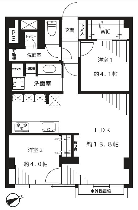 リノベーション:壁・天井クロス、フローリング、建具、洗面・トイレフロアタイル、システムキッチン、シャワーブース、洗面化粧台、トイレ、飾り棚、エアコン×3基、クリーニング