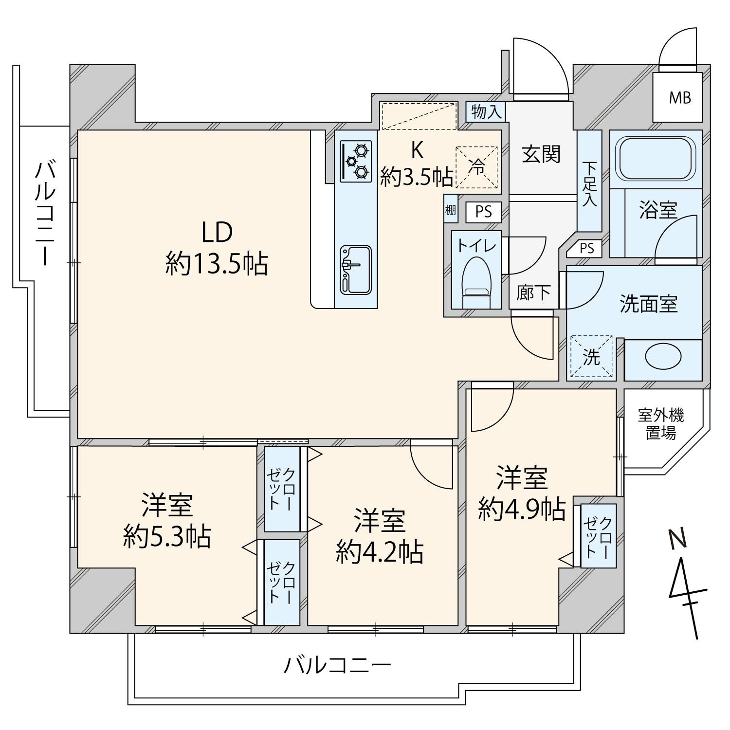 13.5帖の広々としたLDKは、家族が集まる中心地として開放的な空間を演出します。各室にクローゼットが配置されているため、荷物が多い家庭でも居住スペースをスッキリと保つことができ、整理整頓のストレスから解放された心地よい生活を実現します。
