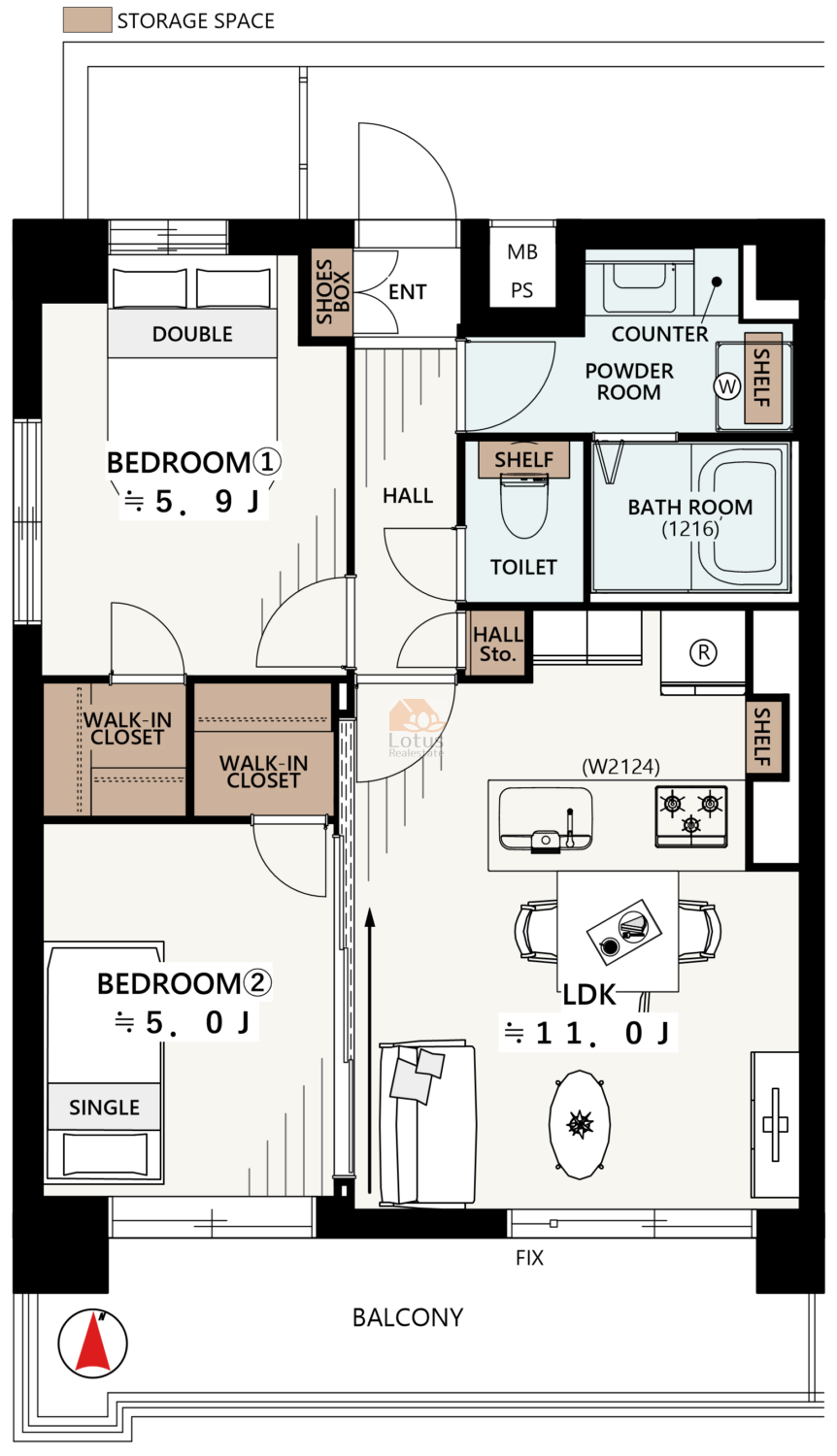 柱が目立たないアウトフレーム工法により、デッドスペースを減らし、家具を有効に配置できる工夫がなされています。収納不足の悩みを解消するWICも各室に配置され、常に整理整頓された美しい暮らしを維持できます。