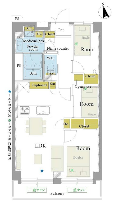 リノベーション:システムキッチン、ユニットバス、洗面化粧台、トイレ、フローリング、建具、収納棚、壁・天井クロス、フロアタイル、エアコン(1基)、照明器具