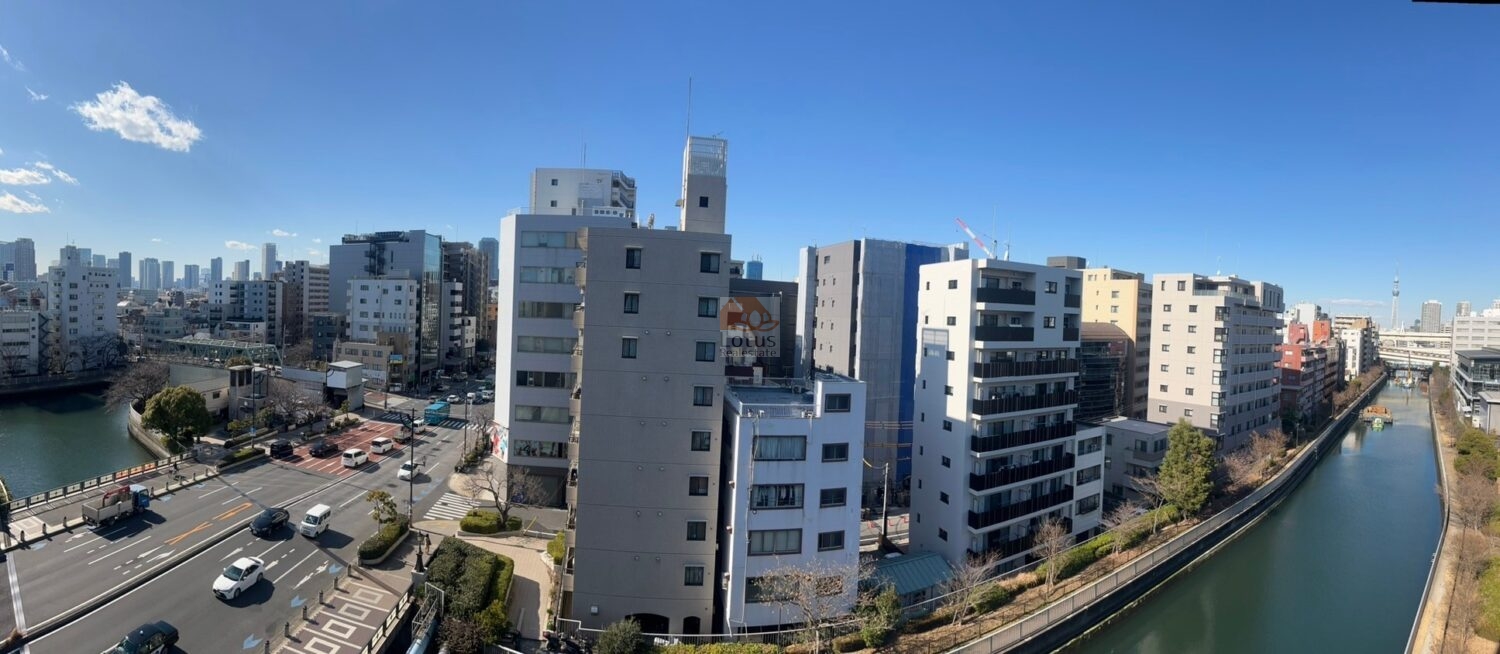南向きの8階部分に位置し、3方角部屋のため陽当たりと開放感に恵まれています。平久川沿いの眺望からはスカイツリーも望め、都市の喧騒を忘れさせるリラックスした時間を提供します。