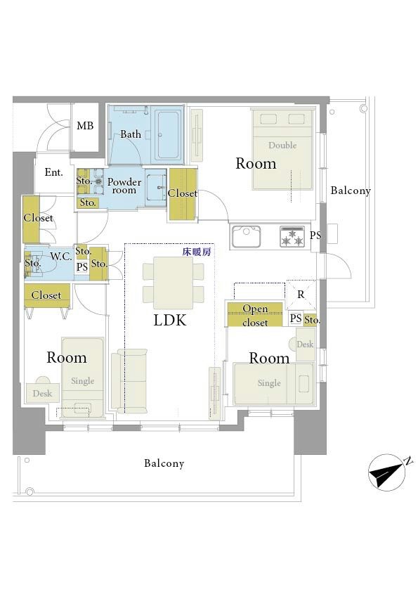 56㎡超の3LDKは、全室採光が確保された角部屋設計です。家族それぞれのプライバシーを保ちつつ、二面バルコニーからの開放感が家庭内に明るく健やかな空気をもたらします。