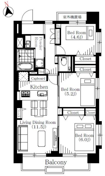 | 面積 | 61.05m² 壁芯(バルコニー6.96m²) | |||