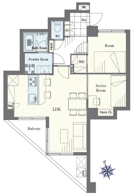 ウォークインクローゼットやシューズボックスなど、片付けの悩みを解消する工夫が散りばめられています。リビングと一体的に使えるサービスルームが、趣味や在宅勤務の時間を充実させます。