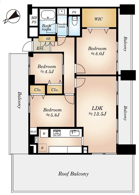 | 面積 | 80.39m² 壁芯(バルコニー35.55m²) | |||