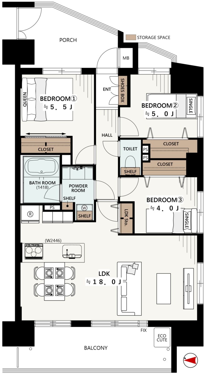 18帖の広々としたリビングと専用ポーチが、家族に戸建てのようなゆとりとプライバシーを提供します。オール電化と最新リノベーション設備の採用で、家事も家計もスマートにこなせる安心の住まいです。