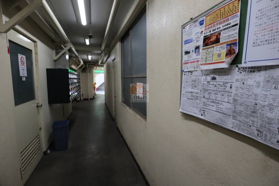 ハピーハイツ亀戸の共用通路。集合ポストとテナント入口が並び、天井に連続照明、床面に排水口を確認。メンテナンス性と日常管理に配慮された造り。