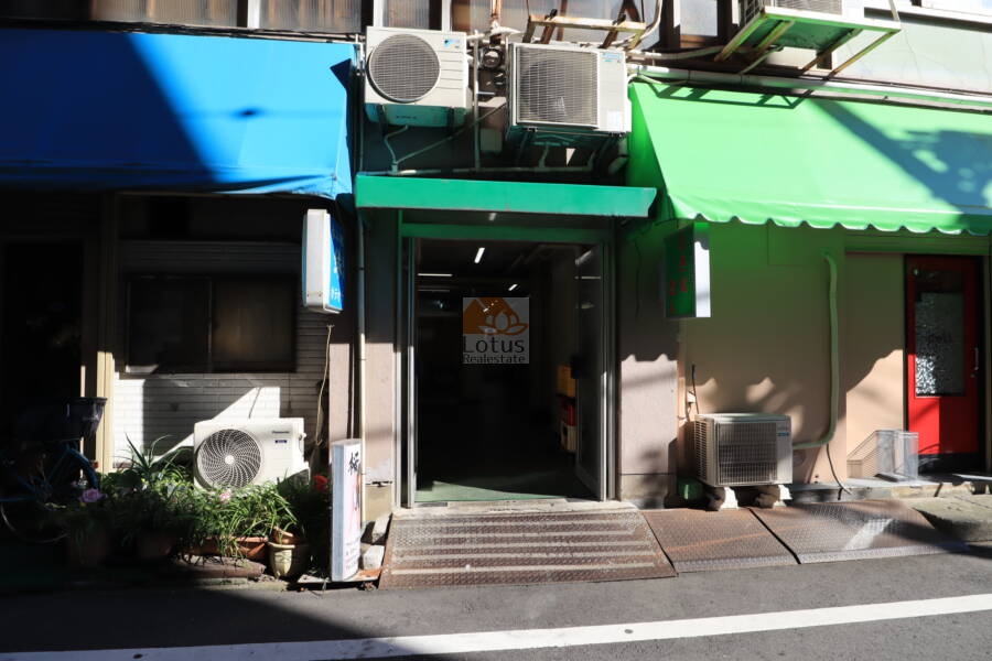 ハピーハイツ亀戸のエントランス前。1階に飲食店などの路面店舗が並び、前面は一方通行の細街路。建物直下で店舗利用やテイクアウトにアクセスしやすい動線。