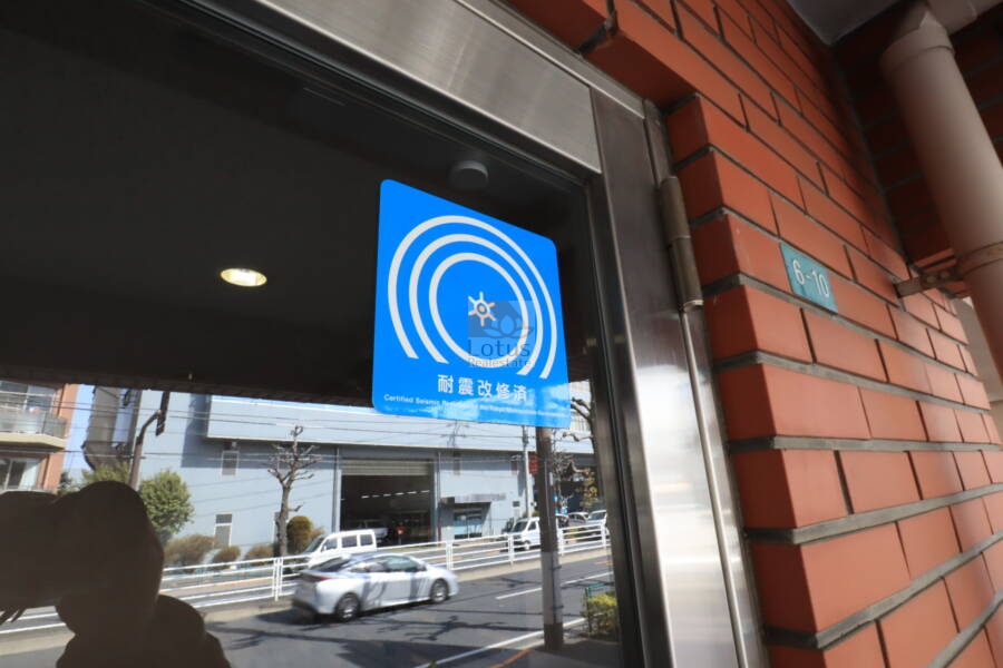 耐震性は平成30年に耐震補強工事を実施して新耐震相当になります。区の要安全確認計画記載建築物の耐震診断結果にも改修済みとの記載があり、現地エントランスにも耐震マークの掲示があります。